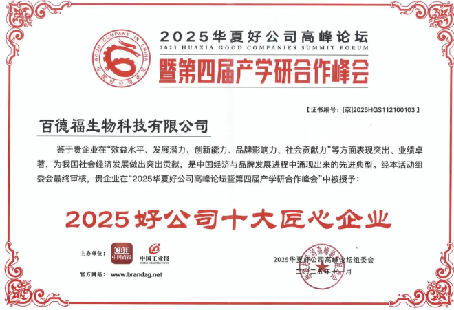 与此同时,备受瞩目的榜单也在会上揭晓,百德福生物科技有限公司凭借在“效益水平、发展潜力、创新能力、品牌影响力、社会贡献力”等方面的突出表现,荣获“2025好公司十大匠心企业”称号。