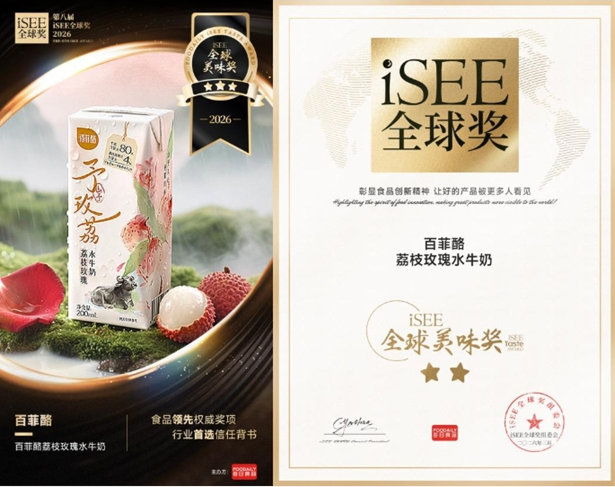 多年来,百菲乳业紧抓乳制品消费升级与特色乳品发展的历史机遇,借助得天独厚的地域与资源优势,从区域性品牌快速成长为全国消费者认知度较高的特色水牛乳制品品牌。作为“食品饮料行业创新风向标”,iSEE全球奖不仅是承载全球视野、产业思维的权威舞台,更是将中国食品实力与新中国味推向世界的窗口。百菲酪两款水牛奶产品斩获iSEE全球美味奖,既是品牌从地域乳企迈向全国乳企的实力印证,更彰显了其以中国风味为名片、向高质量乳企目标迈进的坚定决心。(来源:中国经济新闻网)